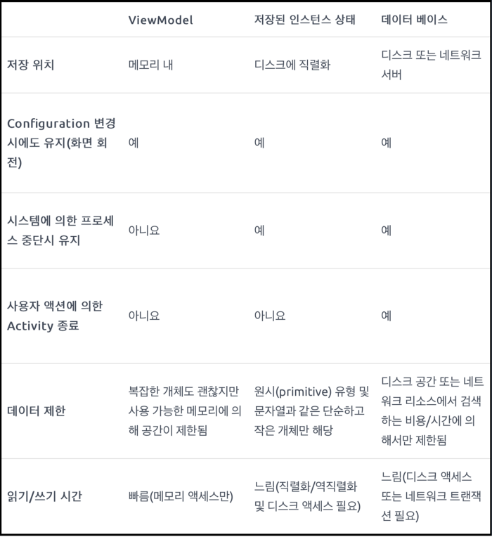 ViewModel은 Configuration 변경의 경우 사용됩니다. 하지만 시스템에 의해서 Activity가 종료되는 경우 ViewModel도 같이 메모리에서 제거 되기 때문에 UI 상태를 보존할 수 없습니다.