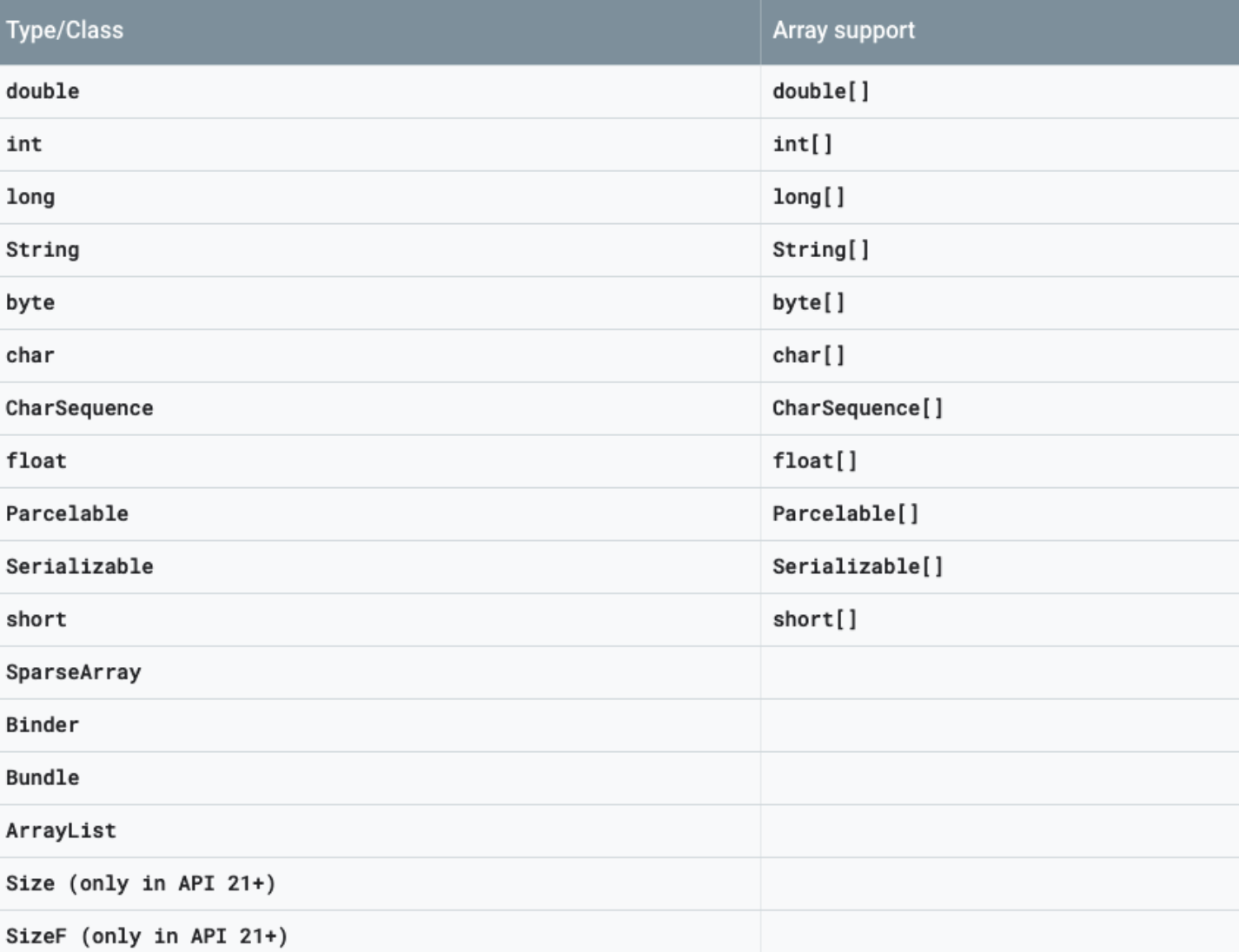 Key-value 로 이루어진 Map 형태로 저장이 되는데 여기에 들어갈 수 있는 형은, Bundle 에 저장하므로 동일하게 처리가능한 형만 저장이 가능합니다.
