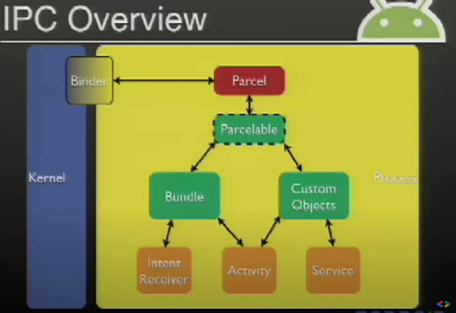 - IPC를 사용하는 예로서는 Intent, System Service, Content Provider등 안드로이드 구성요소에 사용됩니다.