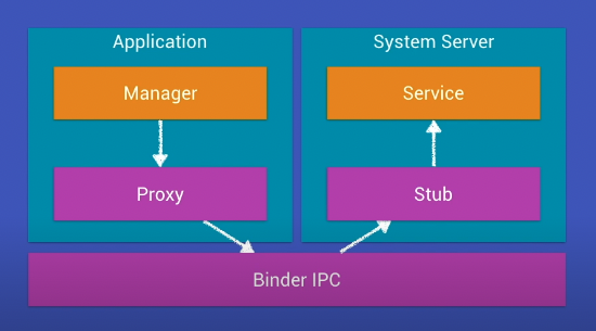 안드로이드의 모든 어플리케이션들은 위와 같이 시스템 서버와 통신하기 위해서는 proxy → binder IPC → Stub 라는 통로를 거치게 됩니다. 이를 조금 더 쉽게 이해하기 위해서는 안드로이드 RPC 및 IPC 를 이해하고 넘어가야 합니다.