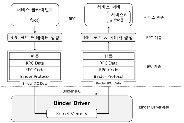 위 그림에서 알 수 있듯이 클라이언트 라고 불리우는 프로세스가 서비스 프로세스의 foo() 라는 함수를 호출할때 RPC 코드와 데이터를 생성해서 바인더를 통해 넘어가는 것을 알 수 있습니다. 이는 매우 단순화된 부분이지만, 이정도만 안다면 왜, 안드로이드 내부에서 액티비티간에 혹은 서비스와 통신할때 무엇을 하는지 조금 더 잘 이해할 수 있습니다.