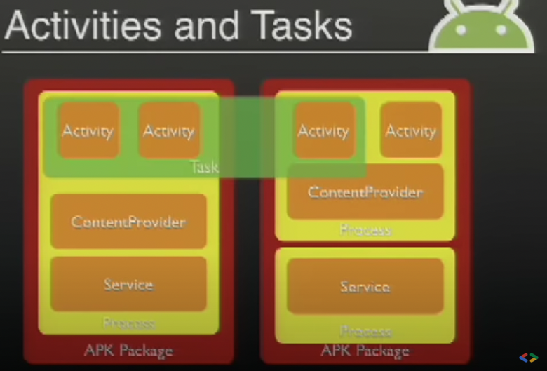 - 프로그래머가 만든 하나의 apk 패키지는 1개의 프로세스를 기본적으로 할당받게 됩니다. 그리고 여러 앱을 실행시키기 위해서는 실행되고 있는 프로세서들을 알고있는 안드로이드 OS가 직접 실행시키게 되는것이며, Task를 가지고 서로다른 프로세스에 있는 activity들을 실행시키기 위해서는 OS가 직접 액티비티 매니저를 통해 관리하는 것이 효율적일것입니다.