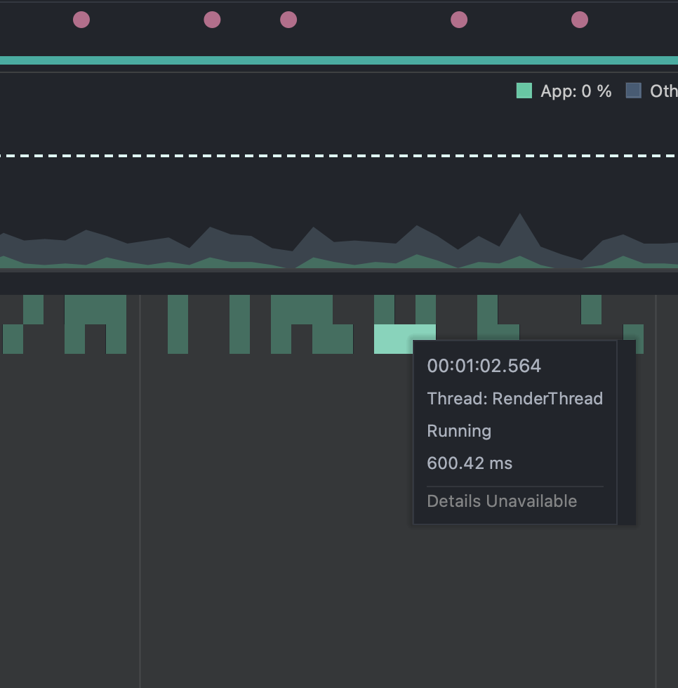 이 문제를 정확히 파악하기 위해 프로파일러를 활용해 분석을 진행했으며, 아래에서 문제를 해결해 나간 과정을 공유하고자 합니다. (기존 프로젝트에서 예전 코드를 적용하여 프로파일러로 캡처한 화면입니다.)